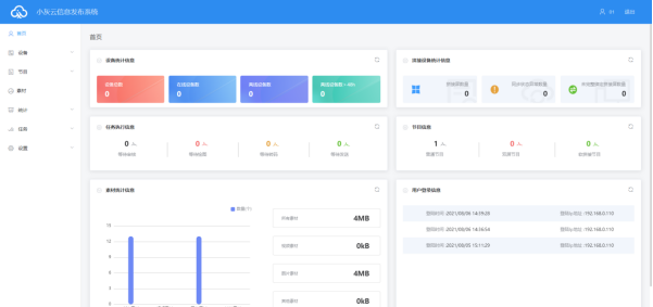 系統(tǒng)模塊LCD小灰云信息發(fā)布系統(tǒng)采用B/S系統(tǒng)架構(gòu),含有首頁(yè)、設(shè)備、節(jié)目、素材、統(tǒng)計(jì)、任務(wù)和設(shè)置模塊。圖1-1系統(tǒng)管理模塊?登陸界面:用戶登陸、切換語(yǔ)言等。?首頁(yè):設(shè)備統(tǒng)計(jì)信息、拼接設(shè)備統(tǒng)計(jì)信息、任務(wù)執(zhí)行信息、節(jié)目信息、素材統(tǒng)計(jì)信息、用戶登錄信息。?設(shè)備:設(shè)備分組、設(shè)備上/下線狀態(tài)、時(shí)間校正、亮度調(diào)整、固件升級(jí)等操作,設(shè)備“詳情”中可以看到設(shè)備運(yùn)行狀態(tài)信息、節(jié)目信息、發(fā)布記錄和上下線記錄等。?節(jié)目:包含單個(gè)節(jié)目和節(jié)目單設(shè)置,新建節(jié)目、節(jié)目編輯、節(jié)目預(yù)覽、節(jié)目發(fā)布等操作。節(jié)目列表中可查看節(jié)目“發(fā)布記錄”、播控設(shè)置和GPS定點(diǎn)播放等。?素材:上傳視頻、圖片、GIF動(dòng)畫、Word、PPT、表格、待審...