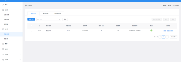 點(diǎn)擊【節(jié)目】,進(jìn)入到節(jié)目列表,可對(duì)節(jié)目重命名、預(yù)覽、編輯、復(fù)制、發(fā)布、歷史記錄、節(jié)目創(chuàng)建者、修改時(shí)間等操作,如果節(jié)目比較多,可以在節(jié)目名稱后面的文本框輸入關(guān)鍵字,點(diǎn)擊“查詢”按鈕即可,圖3-1。圖3-1節(jié)目列表?ID:節(jié)目的ID;?節(jié)目類型:創(chuàng)建節(jié)目時(shí)選擇的設(shè)備類型;?節(jié)目名稱:創(chuàng)建節(jié)目的名稱;?分辨率:創(chuàng)建節(jié)目的模擬顯示屏的大小;?時(shí)長(zhǎng):節(jié)目總時(shí)長(zhǎng);?創(chuàng)建者:創(chuàng)建節(jié)目的用戶名稱;?修改時(shí)間:最后編輯節(jié)目的時(shí)間;?狀態(tài):如果節(jié)目?jī)?nèi)容沒(méi)有暴力恐怖、色情違法或敏感詞匯,則為綠色圖標(biāo),AI一般可以審核通過(guò);否則為紅色,需要人工再審核才能通過(guò);?操作項(xiàng):可對(duì)節(jié)目預(yù)覽、編輯、重命名、GPS定點(diǎn)播放、播控...